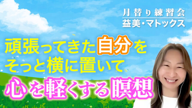 月替わり 練習会 ★月替り練習会4月★頑張ってきた自分をそっと横に置いて心を軽くする瞑想|益美・マトックス講師 2026年4月1日 yoshihiro_t https://reiki-online.jp/wp-content/uploads/2020/09/japanreikilogo.png NPO法人 日本レイキ協会 オンラインサロン レイキスタ
