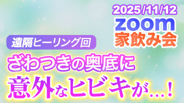 ライブ見逃し配信 11月12日Zoom家飲み会♪ 遠隔ヒーリング回「ざわつきの奥底に意外なヒビキが…!」見逃し配信のお知らせ 2025年11月14日 yoshihiro_t https://reiki-online.jp/wp-content/uploads/2020/09/japanreikilogo.png NPO法人 日本レイキ協会 オンラインサロン レイキスタ