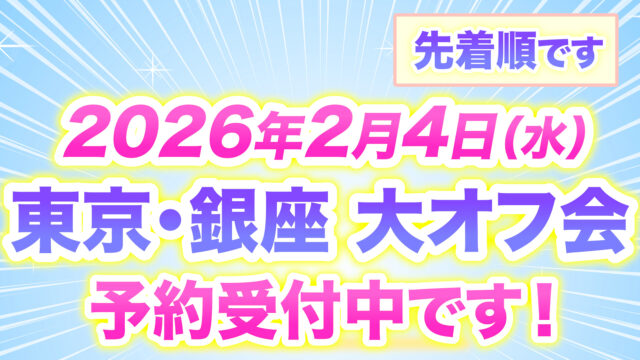 オフ会 オフ会の予約、まだまだ受付中です!◆2026年2月4日「目覚めた人の場」を作りたい!◆ 東京・銀座でオフ会を開催します!! 2026年1月6日 yoshihiro_t https://reiki-online.jp/wp-content/uploads/2020/09/japanreikilogo.png NPO法人 日本レイキ協会 オンラインサロン レイキスタ
