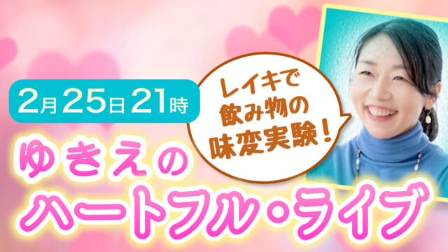 ライブ配信 レイキで飲み物の味変にチャレンジ!★ゆきえの「ハートフル♡ライブ」Zoomで2月25日(水)夜9時から(見逃しあります) 2026年2月25日 yoshihiro_t https://reiki-online.jp/wp-content/uploads/2020/09/japanreikilogo.png NPO法人 日本レイキ協会 オンラインサロン レイキスタ