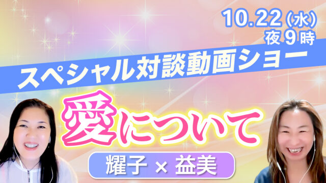 ライブ配信 10月22日(水)21時(夜9時)から「愛」について語る❤️ 耀子 × 益美の「スペシャル対談動画ショー」(見逃し配信もあります) 2025年10月22日 yoshihiro_t https://reiki-online.jp/wp-content/uploads/2020/09/japanreikilogo.png NPO法人 日本レイキ協会 オンラインサロン レイキスタ